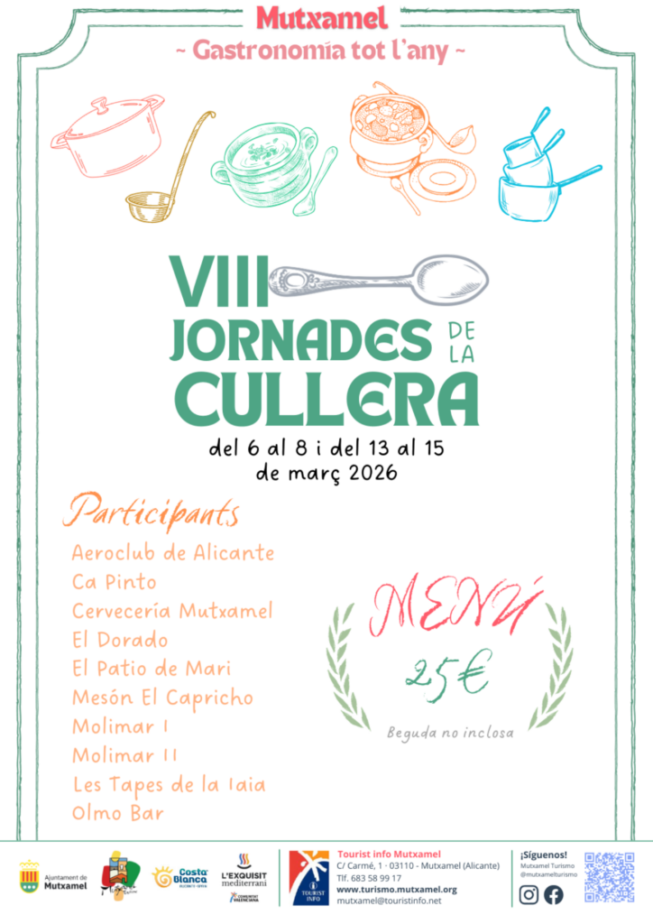 Mutxamel tornarà a convertir-se en referent de la gastronomia tradicional amb la celebració de l’octava edició de les Jornades de la Cullera, que tindran lloc durant dos caps de setmana del mes de març, concretament del 6 al 8 i del 13 al 15 de març de 2026, amb l’objectiu d’oferir més oportunitats per a gaudir dels menús preparats per la restauració local.
