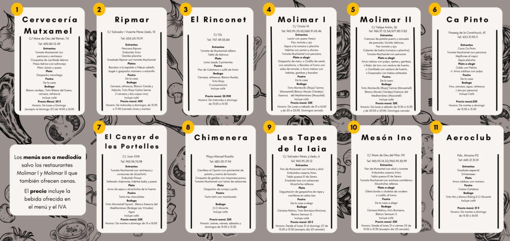 Los once establecimientos que participan en esta edición -dos más que en 20211- son Ripmar, Cervecería Mutxamel, Les Tapes de la Iaia, Mesón Ino, El Rinconet, Restaurante Molimar I, Restaurante Molimar II, Ca Pinto, Aeroclub, Gastrobar Chimenera y el Restaurante El Canyar de les Portelles.